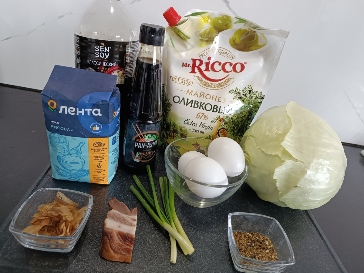 Здравствуйте, дорогие друзья! Сегодня на завтрак или ужин предлагаю приготовить японский блинчик «Окономияки». Вариантов его приготовления великое множество, я поделюсь своим. Мне нравится восточная кухня, предлагаю и вам попробовать. Готовим, как всегда, Нам понадобятся: Яйца - 3 шт., Мука (желательно рисовая) - 2-3 ст.л., Капуста, Зелёный лук, Бекон, Майонез, Соус соевый, Соус терияки, Стружка тунца «Бонито», Соль, растительное масло, Приправа «Фурикакэ» - по желанию и возможности. Бекон мелко режем, обжариваем. Капусту тонко шинкуем, добавляем к бекону, прогреваем 2-3 минуты. Добавляем зелёный лук и выключаем. Яйца разбиваем в миску, добавляем 2 ст.л. соевого соуса и приправу (можно взять просто чёрный перец или смесь любимых приправ, но вкус немного изменится). Также добавляем муку и тщательно перемешиваем. К тесту выкладываем капусту с беконом, смешиваем. Получившуюся смесь выкладываем в виде блина на разогретую сковороду, обжариваем на небольшом огне. При желании можно накрыть к