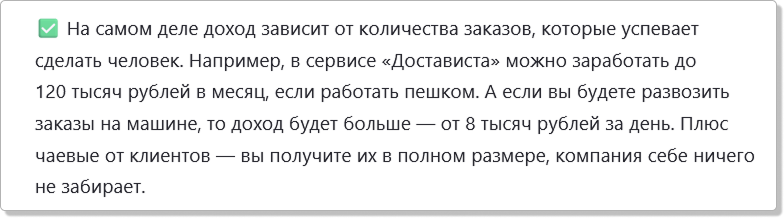 И это правда, друзья, о чем я вам пишу каждую субботу (даже когда она приходится на четверг). Тысяча-полторы в день - это вполне себе ДО 120 тысяч рублей. Не больше. Работай без выходных, не 6-7 часов, как я, а 14-15, может, удастся заработать тысячи 3-4 в день. Простая арифметика дает понять, что при 100% рабочих дней в месяц без выходных вообще таком режим может выдать заработок, сопоставимый со 120 тыр. Хотя ближе к истине 60-70. Сколько месяцев вы в таком режиме продержитесь - проблемы ваши, а не Доставистины, она свои обязательства выполняет - возможность заработать дает. А что возможность реальна не для этой вселенной - это нюанс.