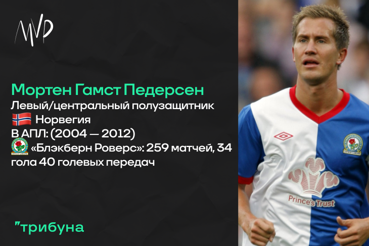 Один из главных норвежцев в истории АПЛ. Мортен, начинавший играть в северном городе Тромсе, перебрался в Англию в 2004 году. Тогда «Блэкберн», еще помнивший вкус Чемпионства, заплатил за молодого полузащитника 2.25 миллиона Евро. Первый сезон в команде Марка Хьюза ушел у норвежца на адаптацию к топовой лиге, а второй уже был ознаменован стремительным ростом. К примеру, именно благодаря дублю Педерсена «Роверс» одержали гостевую победы над сильным «Манчестер Юнайтед» Сэра Алекса Фергюсона. Итоговое шестое место по итогам сезона, двенадцать баллов по системе гол плюс пас и статус одного из лидеров коллектива — такими оказались результаты второго года норвежца в Англии.
