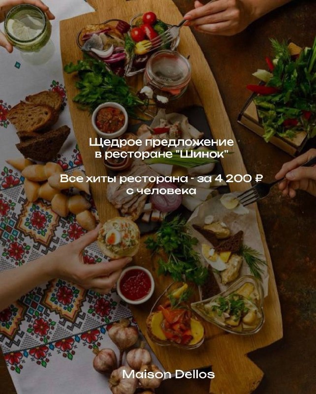 В мае с воскресенья по четверг в ресторане «Шинок» вас ждет не просто ужин, а настоящий праздник вкуса! 🦚 Все хиты ресторана — без ограничений всего за 4 200 ₽ с человека! - Аппетитные хрустящие соленья - Наваристый борщ - Легендарные пирожки - Фирменный медовик 🥘 И ещё десятки любимых блюд — ешьте, сколько душе угодно! Если вы не за рулём, рекомендуем сопроводить предложение акцией «Разгуляй». Акция действует и в праздничные дни. 🎉 Подробности