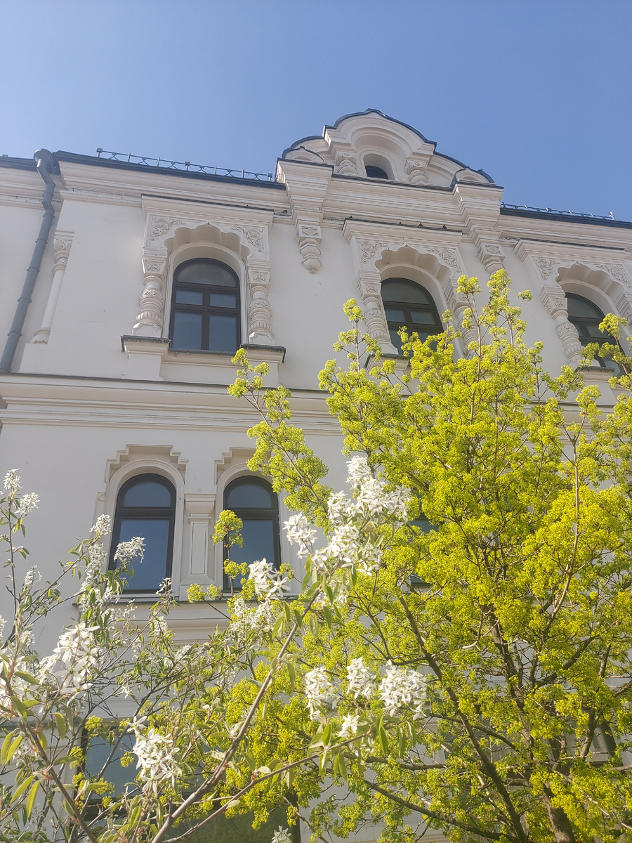К сожалению, в настоящее время здание укрыто защитной фасадной сеткой. Идёт раставрация. Но у меня есть фотография, где дом видно во всей его красе.