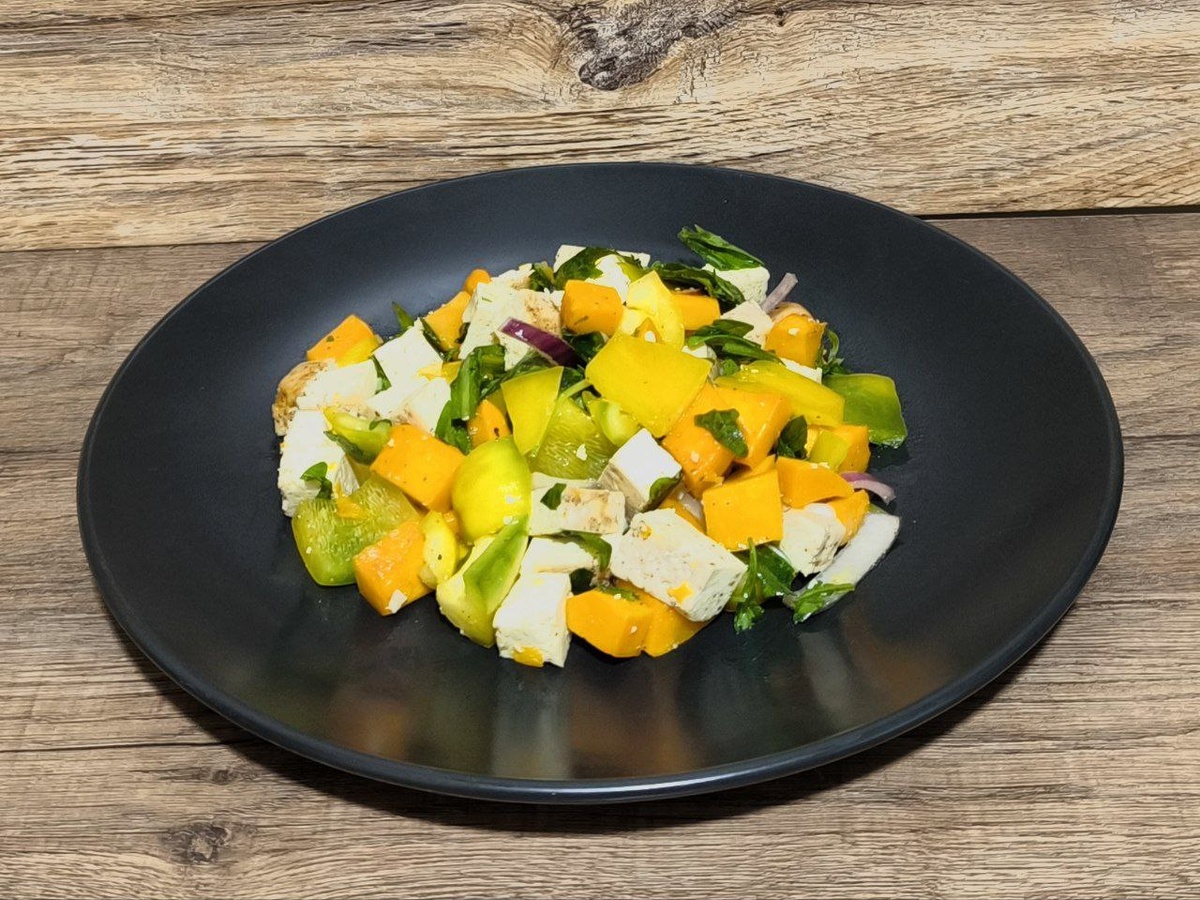 Запечённый салат с тыквой и тофу Купил тут на днях большую тыкву, пока разделывал её и чистил, пришла идея сделать салат с запечённой тыквой. Когда-то пробовал такой в ресторане. Так как сыра фета у меня нет, решил использовать тофу. Белка много, по цвету подходит. Вот так и получился салатик. Кстати, помимо этого салата из тыквы ещё получится: два тыквенных кекса и тыквенные драники. Вот какой многофункциональный овощ, всего один раз его почистил и четыре приёма пищи закрыты. Ингредиенты: Тыква 200-300 г Тофу 200 г Болгарский перец 1 шт Руккола 50-70 г Лук красный 1/2 Льняное масло Яблочный уксус 1 ст.л. Адыгейская соль, чёрный перец молотый Приготовление: Для начала необходимо замариновать тофу. Делаем смесь из столовой ложки яблочного уксуса, адыгейской соли и чёрного перца. Как следует натираем со всех сторон тофу и оставляем на 15-20 минут. В это время я чищу тыкву, в принципе можно об этом рассказать. Для начала хорошо мою её с моющим средством губкой и споласкиваю.