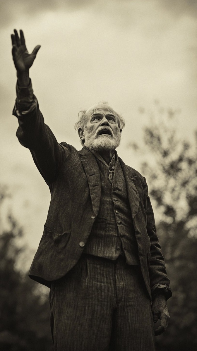 Создано на основе запроса: a fictional elderly man from the 1800s, passionately raising one hand while addressing a group of unseen people