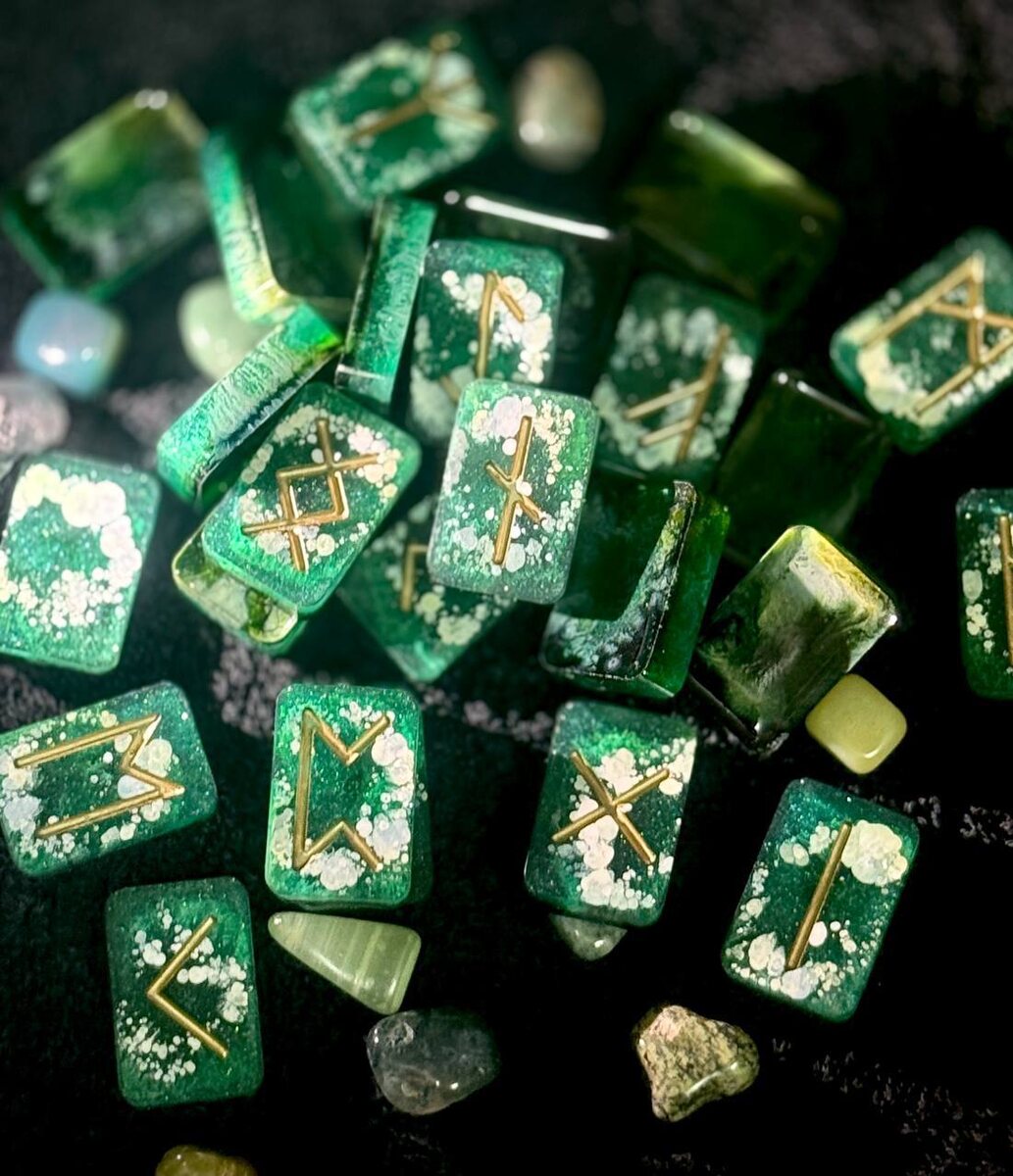 Зелёные скандинавские руны🪨🌲 Руны изумрудного цвета северного леса, припорошенного снегом, хвои в лучах солнца. Для красивой и сильной магии и мантики. Ручная работа из эпоксидной смолы. Размер руны 3 см. Цена набора 1800 рублей Приобрести можно на @witch_lesya или на сайте