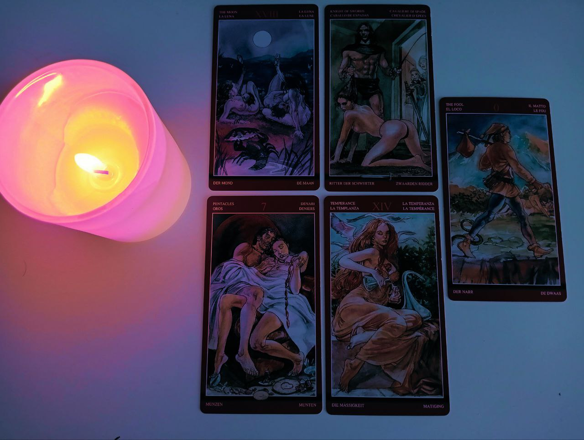 После этой стремительной вспышки Рыцаря под загадочной Луной, мы видим Семерку Пентаклей. Это карта ожидания, оценки, терпеливого вложения труда и... сомнений. После бурного начала (Рыцарь Мечей) наступает пауза. Вы или оба партнера можете оказаться в ситуации, когда нужно ждать плодов, оценивать, стоит ли игра свеч. Возникает вопрос: "А куда мы идем? Стоит ли вкладывать дальше свои силы, время, чувства?" Эта карта, особенно после Луны и Рыцаря Мечей, может указывать на разочарование от того, что быстрые результаты не достигнуты, или на сомнения в истинности того, что казалось таким ярким вначале. Придется запастись терпением и трезво взглянуть на перспективы, которые могут оказаться не такими радужными или быстрыми, как хотелось бы.
