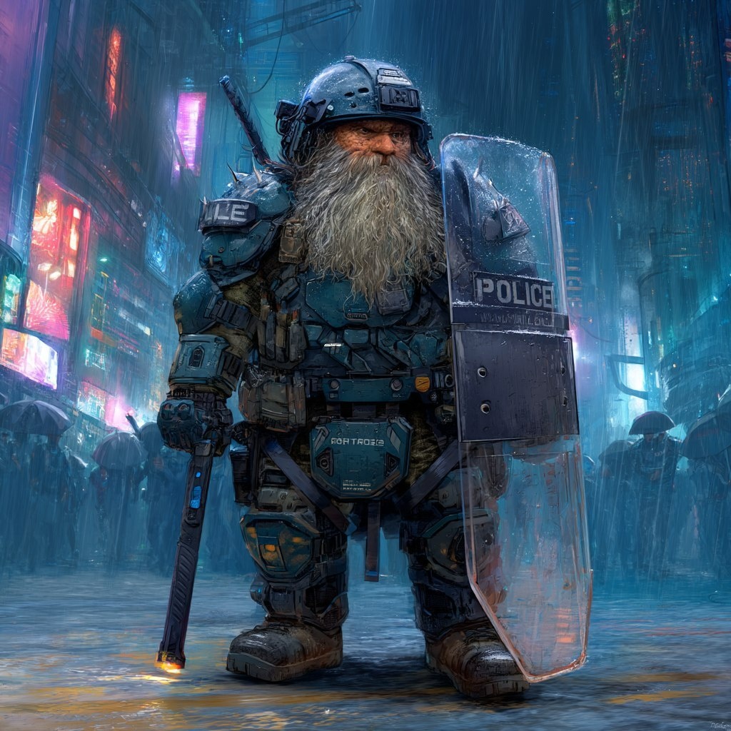 Создано на основе запроса: Full body Shadowrun dwarf riot police character illustration, futuristic riot police armor, Plexiglass riot shield and electric stun stickin hand, riot police helmet, long grey beard, dirty rainy futuristic dystopian city at night background, Highly detailed 8k fantasy illustration,