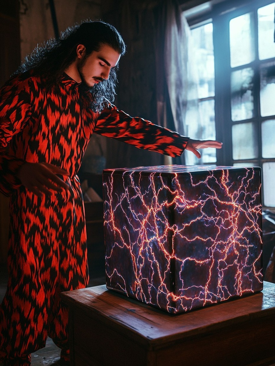 Создано на основе запроса: a photograph of a male mystic wearing shiny red and black patterned clothing standing to the left of a large magical cube standing diagonally on its pointed corner spinning like a top on top of an antique wooden table. The cube is purple, pink, and turquoise. On the surface of the cube, electrical currents move like lightening bolts across the surface. The mystic is holding his hands outward towards the cube as if he were controlling it. In the background is a messy apartment bedroom with large open windows. Sony A65 camera. --- Автоперевод: Фотография мужского мистика в блестящей красной и черной одежде с рисунком, стоящей слева от большого волшебного куба, стоящего по диагонали на его остроконечном углу, вращающемся, как вершина на антикварном деревянном столе. Отлично получилось? 🤔 https://dzen.ru/id/65c0c65c86e4f837c27b24d7 #ИИ #AI #нейросеть #midjourney #art