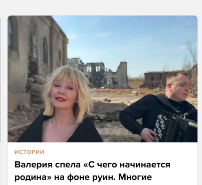 Певица Валерия исполнила песню «С чего начинается родина» на фоне разрушенных домов. Видео ее выступления широко разошлось в сети. На записи Валерия стоит в черном платье, рядом играет баянист, позади видны сильно поврежденные здания. Первоначально видео опубликовал в своем инстаграме первый ассистент мужа певицы, продюсера Иосифа Пригожина Станислав Калинкин. Сама Валерия и Пригожин выложили запись 30 апреля. Пользователей соцсетей возмутило то, что Валерия исполнила песню на фоне разрушенных домов. Появились предположения, что запись сделали в Курской области или на одной из новых территорий — или на фоне хромакея. Ролик сняли среди декораций на территории кинопарка «Москино» под Троицком, сообщила Валерия. В свою очередь, Иосиф Пригожин заявил, что кадры сняли на фоне декораций к фильму «В списках не значился». Видео сняли для программы «Квартирник у Маргулиса», которая выйдет в эфир телеканала НТВ 9 мая. В беседе с журналистами Пригожин отметил, что ни в Бахмут, ни на какие другие