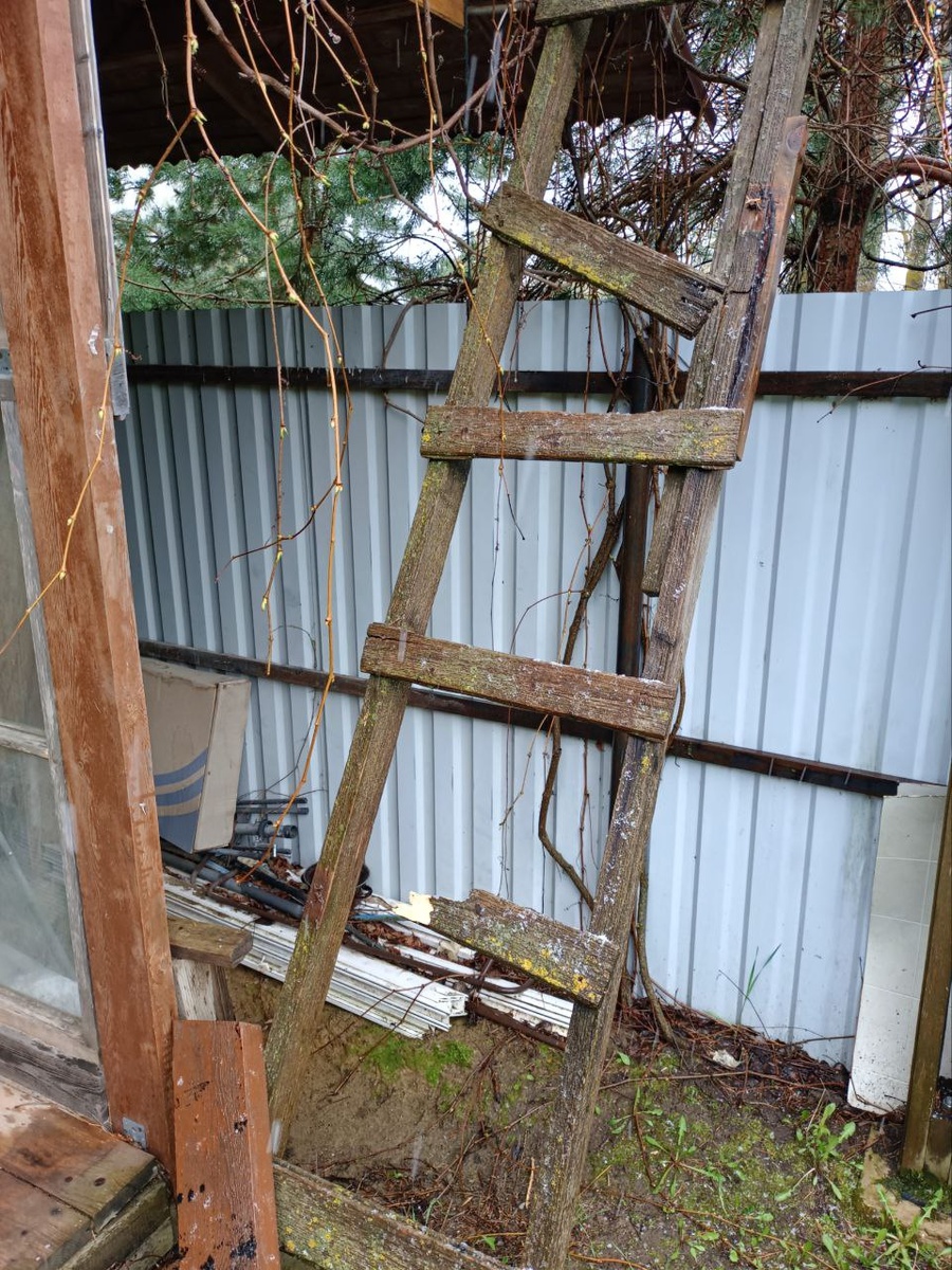 Мне вдруг и срочно понадобилось на крышу залезть. По делам. Ну и вначале сорвалась ступенька за которую рукой держался, а после сломалась ступенька на которой ногой стоял. Медленно, но верно я пал меж опор лестниц, чем попал в ситуацию застревания. Метр тоже высота.