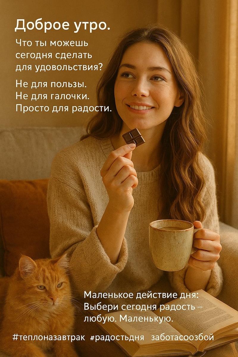 ☀Доброе утро. Что ты можешь сегодня сделать для удовольствия? Не для пользы. Не для галочки. Просто для радости. Шоколадка. Песня. Письмо другу. Что-то маленькое и тёплое. 🔘 Маленькое действие дня: Выбери сегодня радость — любую. Маленькую. #теплоназавтрак #радостьдня #заботасосбой С любовью и тренерской поддержкой, ваш психолог Николай Смирнов