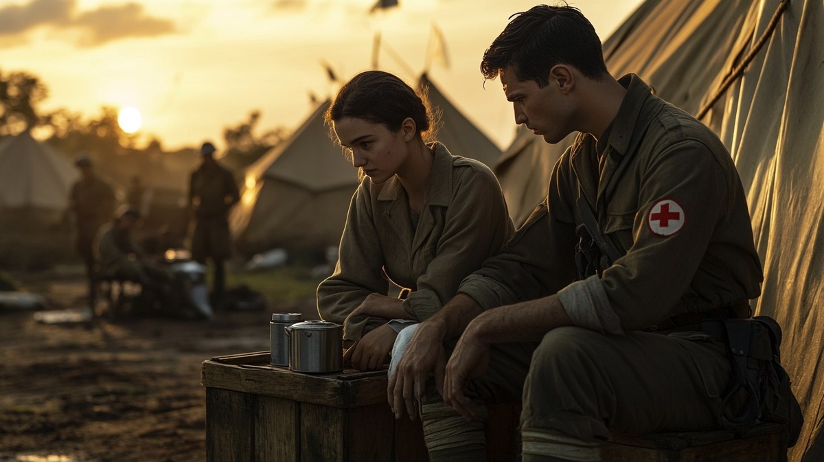 Создано на основе запроса: A quiet, emotional scene in a World War II field hospital in Cassino, Italy, late afternoon. The setting is outdoors at sunset, with the sky painted in soft orange and pink hues. The field hospital consists of canvas tents, worn and weathered, surrounded by scattered medical supplies and crates. In the foreground, two characters sit in silence on a wooden crate just outside a tent. On the left, Émilie, a young French translator in her mid-20s with soft brown hair tied back in a loose bun, wears a modest olive-green uniform with a faded red cross armband. Her expression is calm but reflective, her eyes gazing toward the horizon. Next to her, Major William Carter, an American officer in his early 30s with a rugged appearance --- Автоперевод: Тихая эмоциональная сцена в полевой больнице Второй мировой войны в Кассино, Италия, поздно вечером. Как тебе эта генерация? 🤔 https://dzen.ru/id/65c0c65c86e4f837c27b24d7 #ИИ #AI #нейросеть #midjourney #art