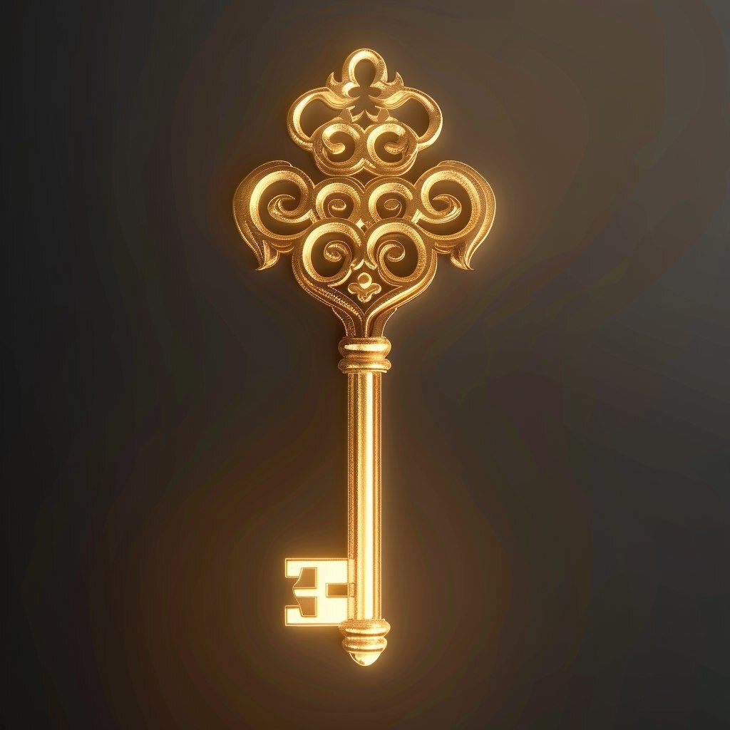 Создано на основе запроса: an ancient ornate key in soft metallic champagne gold, etched with sacred glyphs, glowing slightly, detailed and