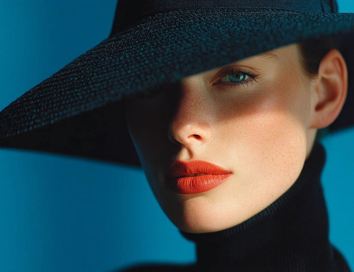Создано на основе запроса: Close-up of the face of a beautiful woman wearing a black hat against a blue background