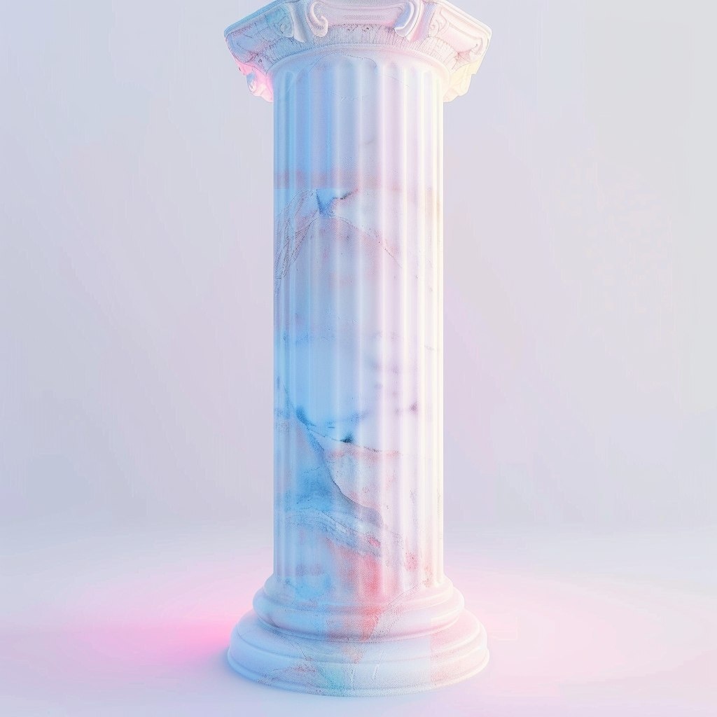 Создано на основе запроса: ethereal temple pillar with soft blush white marble and faint glimmers of pink and blue light, photo-realistic