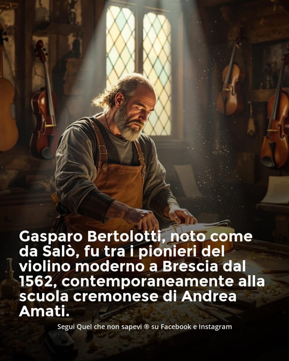 История скрипки Кремона была не единственной колыбелью этого замечательного инструмента. Хотя многие приписывают рождение современной скрипки исключительно кремонской школе Андреа Амати, мало кто знает, что в Брешии мастер лютни одновременно определял особенности этого инструмента, которому навсегда суждено было навсегда изменить западную музыку. Гаспаро Бертолотти, известный как Гаспаро да Сало, начал свою деятельность в Брешии в 1562 году, как раз когда кремонская школа делала свои первые шаги. Брешианская традиция производства струнных иснтрументов уже процветала, в некотором роде предвкушая кремонскую. Как будто у скрипки было два отца, в своего рода отцовство, деленное между двумя городами всего в 50 километрах друг от друга. Это соперничество, малоизвестное, но увлекательное, способствовало итальянскому совершенству в деле музыкальных инструментов, которая и сегодня удивляет мир. Умелые руки таких ремесленников, как Гаспаро да Сало, сформировали не только традицию производства ст