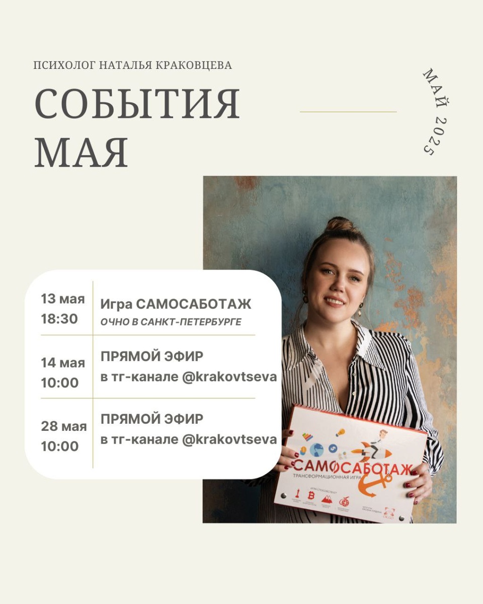 🔠🔠🔠🔠🔠🔠🔠🔠🔠🔠 Друзья, у нас с вами есть несколько поводов встретиться: 13 мая в 18:30 проведу для вас игру «Самосаботаж». Очно в центре Санкт-Петербурга. Я провожу её сейчас редко, и это классная возможность увидеться нам с вами вживую и поработать со своей прокрастинацией. Игра помогает: ✅ увидеть подсознательные причины вашего Самосаботажа: когда очень хочу что-то начать, что-то сделать, но не делаю. ✅ и начать действовать. Также в мае пройдут два прямых эфира здесь, в канале. 14 мая и 28 мая в 10:00 (мск) Темы пока открыты. Если есть что-то, что вам интересно, во что хочется углубиться, пишите в комментариях. Вносите время прямых эфиров в свое расписание, и записывайтесь на игру. Буду вам очень рада🌿