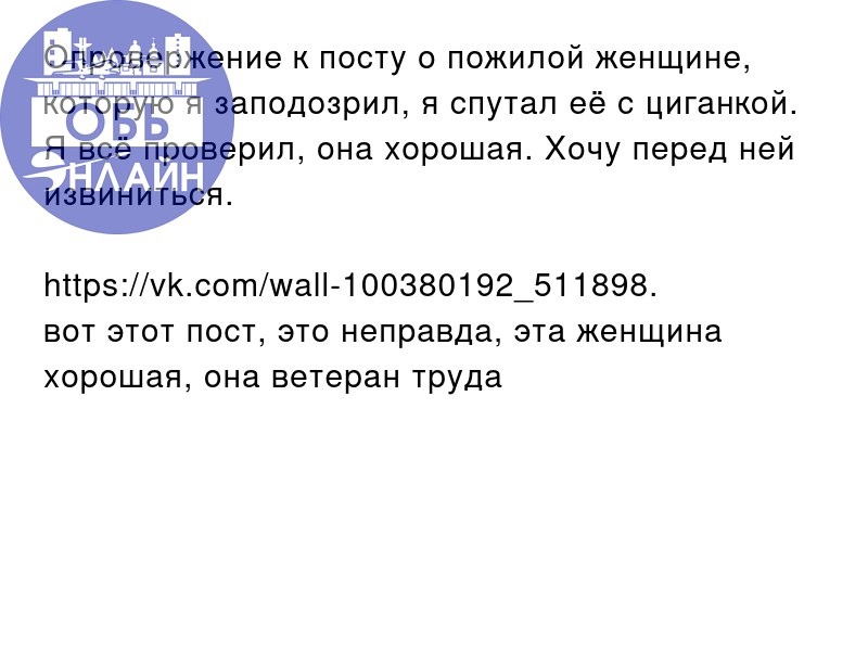 ↗ Опровержение к посту о пожилой женщине, которую я заподозрил, я спутал её с циганкой. Я всё проверил, она хорошая. Хочу перед ней извиниться. https://vk.com/wall-100380192_511898. вот этот пост, это неправда, эта женщина хорошая, она ветеран труда vk.com Подробнее на https://vk.com/ob.gorod #городобь #городобьонлайн #толмачево