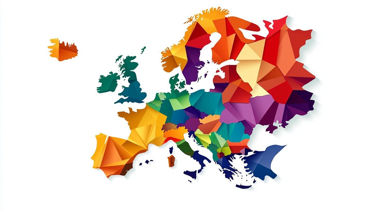 Создано на основе запроса: flat vector map of Europe, simplified shapes, each country in a different solid color, no text or labels, clean