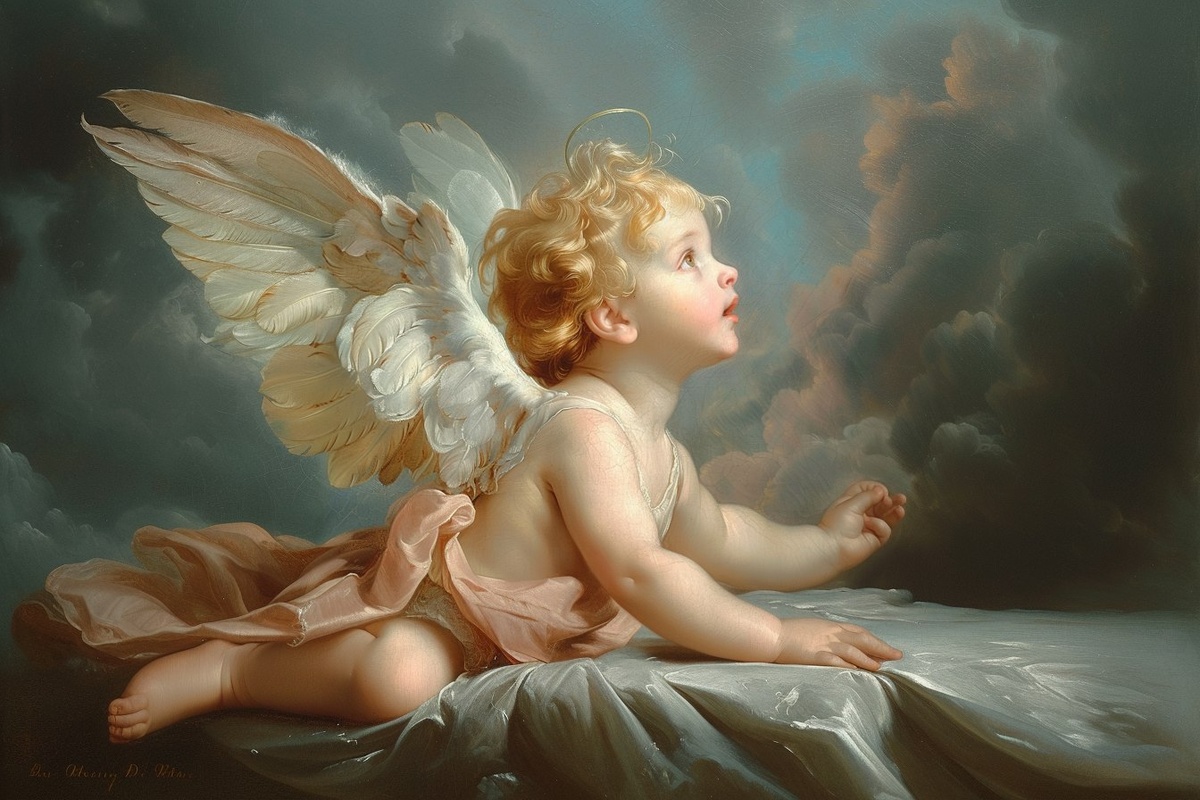 Создано на основе запроса: a softly repainted image of a cherub around 2 years old, full side profile facing right, entire body and head