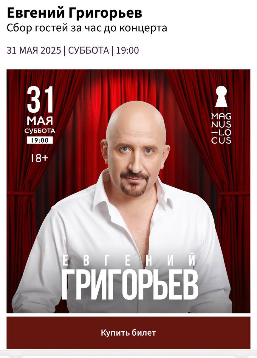 Друзья, 31 мая в Московском клубе-ресторане «Magnus-Locus» состоится наша долгожданная встреча! Переходите по ссылке и спешите приобрести последние билеты: https://magnuslocus.ru/afisha/1588_evgenij-grigorev #москва #концертжеки #евгенийгригорьев #magnuslocus