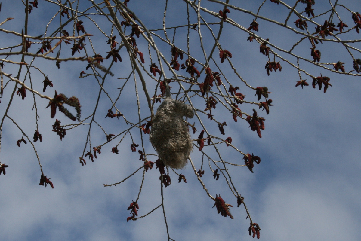Что за сумка болтается на тополе? Это гнездо ремеза. Его мастерил самец. И, на наш вкус, сделал немало ошибок. Во-первых, близко к дороге. А опыт подсказывает, что птицам от человека, тем более от отдыхающего, от «человека на природе», нужно держаться подальше. Во-вторых, «чулок» из тростникового пуха, травинок, тополиных «липучек» подвешен так, что доступен всем ветрам. Гнездо раскачивается, как качели в экстремальном аттракционе. Впрочем, у нашего строителя где-то еще готовы один-два гнезда. На любой вкус капризной самки. Так у этих птиц заведено: самец мастерит несколько гнезд, а самка выбирает из них лучшее. «Не хотите болтаться на ветру – пожалуйте в заросли ивняка, – примерно так мог бы сказать ремез-самец своей избраннице. – Там уютное гнездышко прямо над водой. Там тихо и спокойно! А можно полететь в тростник, там, в глубине зарослей, я тоже кое-что подготовил… Скромная, но очень удобная жилплощадь для молодой семьи…». «Конечно, над водой лучше, – ответила бы самочка-ремез. – М