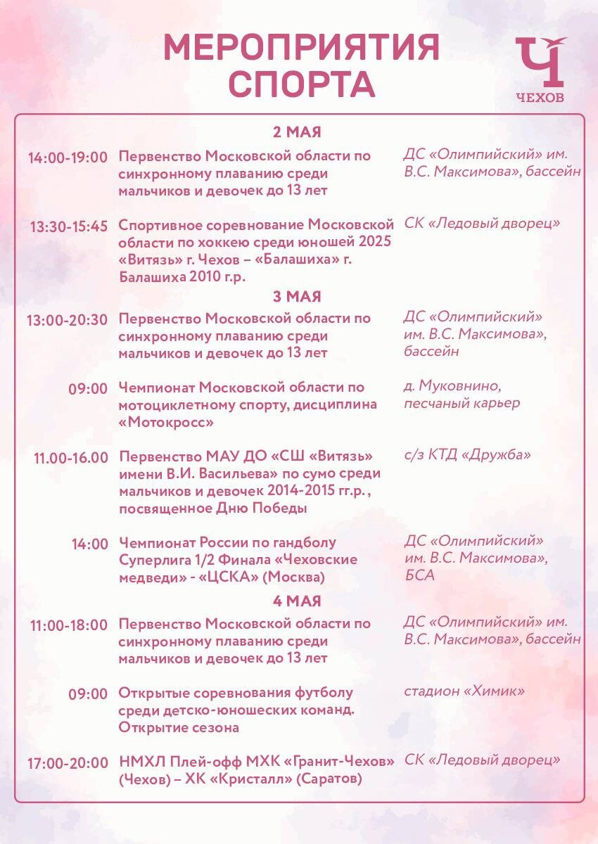 ✨ Спортивные мероприятия в Чехове со 2 по 4 мая Вашему вниманию представим все спортивные мероприятия в ближайшее время🥊🏒 🚫 Возраст: 6+ 📆 04.05.2025 ✅ Мероприятия Чехов https://dzen.ru/id/66cc4b48e9ef144699238a51 http://vk.com/chekhov_events http://dzen.ru/chekhov_events
