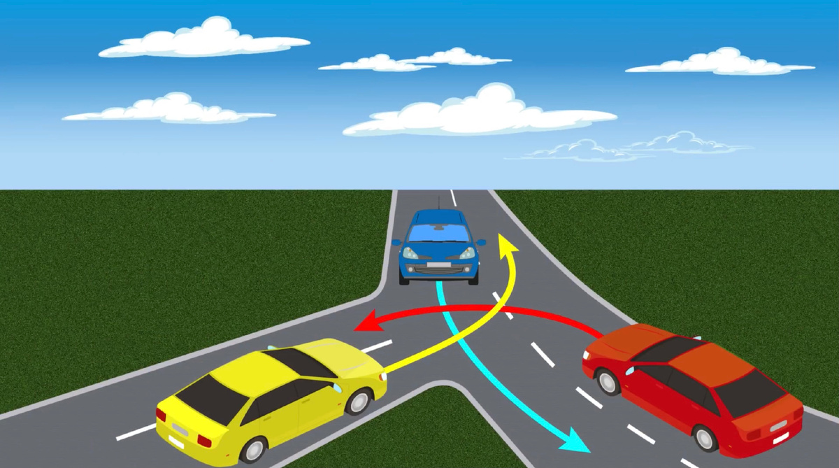 Доброго времени суток, дорогие друзья! Пршу вас подписаться на канал, чтобы не пропустить новые задачи по ПДД. А мы переходим к разбору сложной задачи на сегодня. Друзья, в данной задаче по ПДД нам нужно выяснить, кто из водителей проедет этот перекресток первым. Ответ 1 — водитель синего автомобиля. Ответ 2 — водитель красного автомобиля. Ответ 3 — водитель желтого автомобиля. Ответ 4 — водители разъедутся по взаимной договоренности. Не подглядывая в ответ,напишите свой коментарий, кто из водителей проедет этот перекресток первый. Разбор задачи. Водители приблизились к несимметричному перекрестку с одинаковым покрытием. Также мы видим, что знаки приоритета на таком перекрестке отсутствуют. Соответственно, перед нами нерегулируемый перекресток равнозначных дорог. Ничего сложного здесь, казалось бы, нет. Водителям необходимо разъехаться по помехе справа. Многие из вас скажут, что водитель синего автомобиля, двигаясь как бы в прямом направлении, проедет этот перекресток первым, но эт