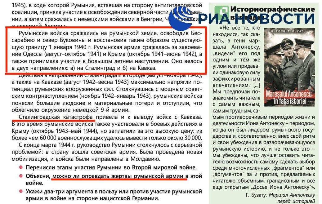 Авторы посвятили целый раздел участию Румынии во Второй мировой войне. В нем ученикам предлагают попробовать оправдать "жертвы румынской армии" в этой войне. Тот факт, что румынские войска оказались на территории Молдовы в качестве оккупантов в учебнике полностью игнорируется, авторы уверяют школьников, что они "сражались на румынской земле, освободив Бассарабию и север Буковины". Освобождение Молдовы от фашистских захватчиков в издании назвали "серьезной проблемой", с которой столкнулось руководство Румынии, отмечает РИА Новости.