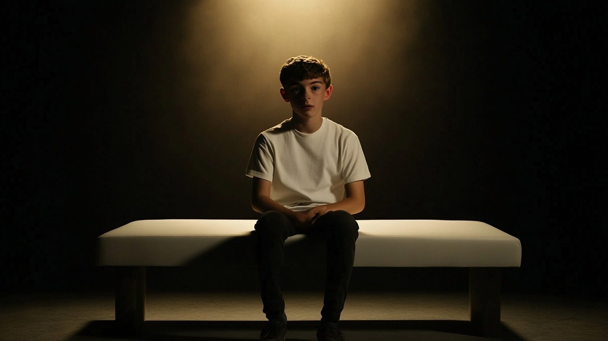 Создано на основе запроса: a medium shot of a 14 year old boy sitting on a white bench speakig directly to camera in this dark studio