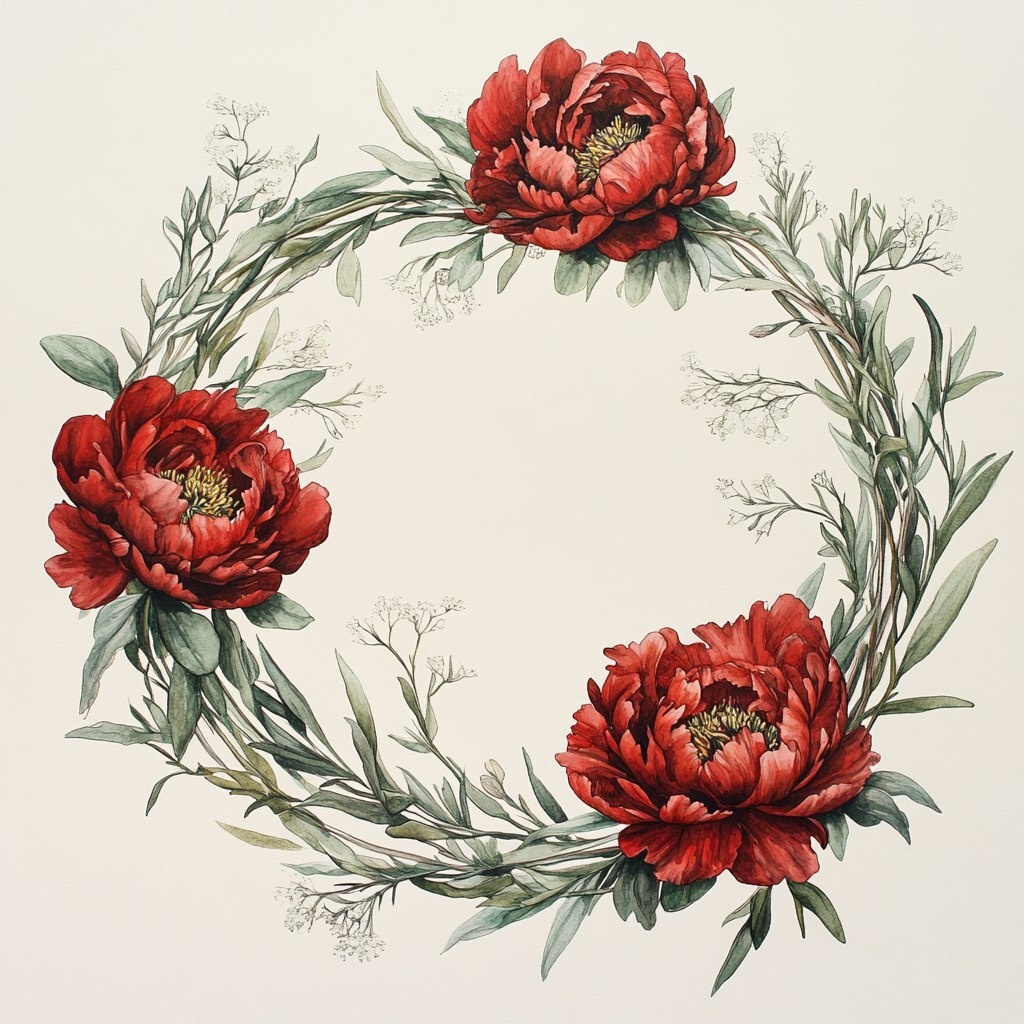 Создано на основе запроса: http:// reef of olive branches with red peony’s in three oval circular positions with babies breath and thyme