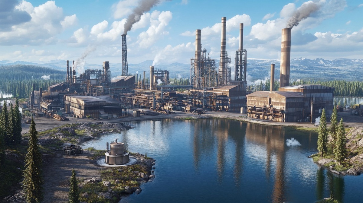 Создано на основе запроса: A large steel factory with towering chimneys and water plants, photo-realistic landscapes, the lake in front of