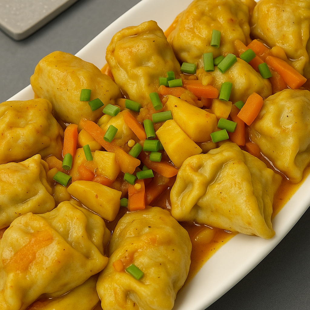 Это блюдо - настоящая находка для тех, кто любит сытную домашнюю еду. Нежные рулетики с сочной начинкой, тушеные с ароматной картошкой, согреют вас в любую погоду! Для теста: Для начинки: Для тушения: 1.Приготовление теста: В большой миске смешайте муку и соль. В отдельной емкости слегка взбейте яйцо с водой и растительным маслом. Постепенно вливайте жидкую смесь в муку, замешивая мягкое, эластичное тесто. Вымешивайте тесто около 10-15 минут. Скатайте тесто в шар, смажьте растительным маслом, накройте полотенцем и оставьте на 30 минут отдохнуть 2.Приготовление начинки: Очистите лук и чеснок. Мелко нарежьте лук, чеснок пропустите через пресс.