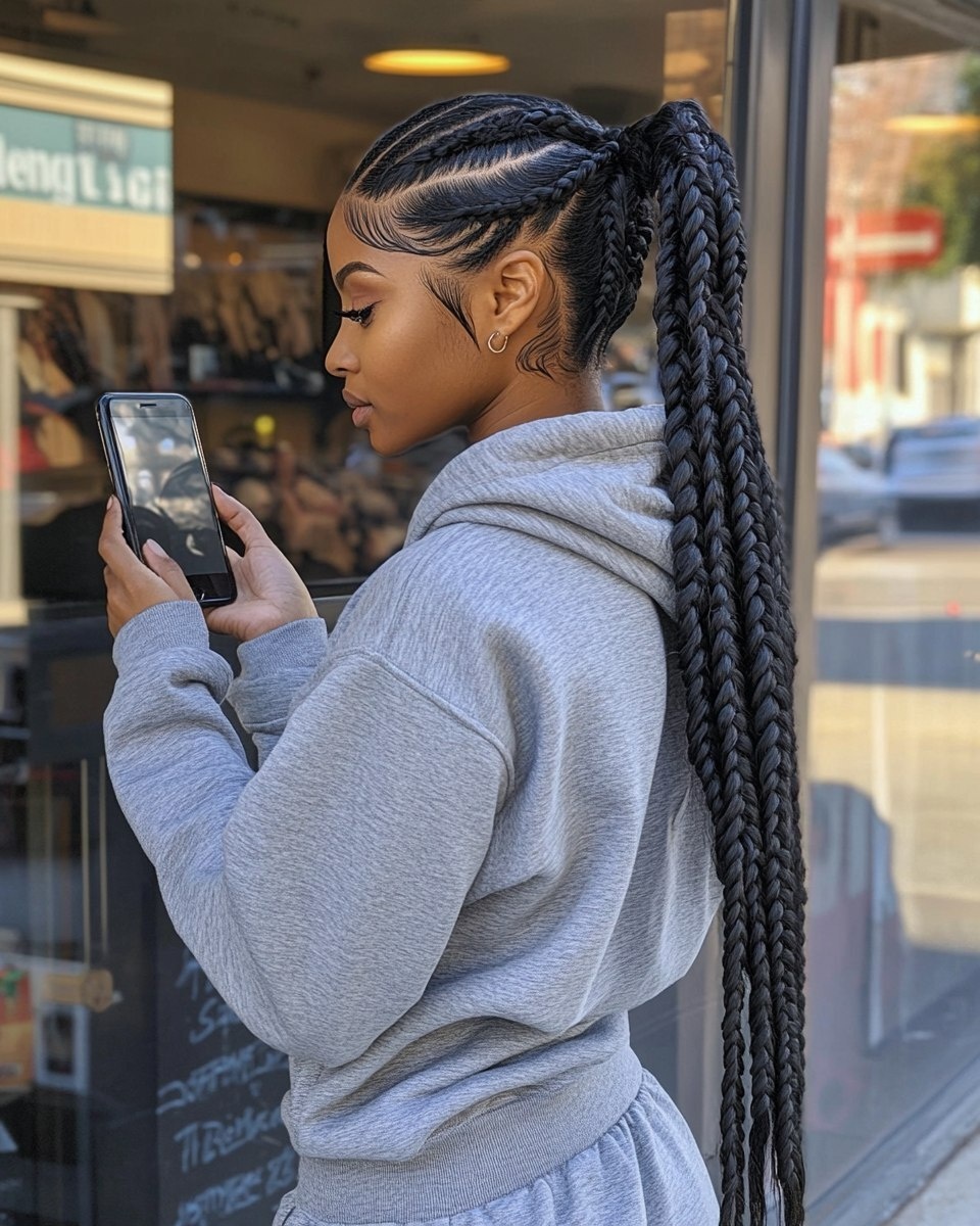 Создано на основе запроса: An African American woman with long black hair, wearing a grey hoodie and sweatpants, is standing outside a store, looking at her phone and taking a picture of her braided hairstyle. She has a ponytail with big, knotless cornrows in the middle of her head, and her baby hairs are visible at the edges. She is not wearing any jewelry. The image is photorealistic. --- Автоперевод: Афроамериканская женщина с длинными черными волосами, одетая в серую толстовку и спортивные штаны, стоит возле магазина, смотрит на свой телефон и фотографирует ее плетнюю прическу. Как тебе такое изображение? 🤔 https://dzen.ru/id/65c0c65c86e4f837c27b24d7 #ИИ #AI #нейросеть #midjourney #art