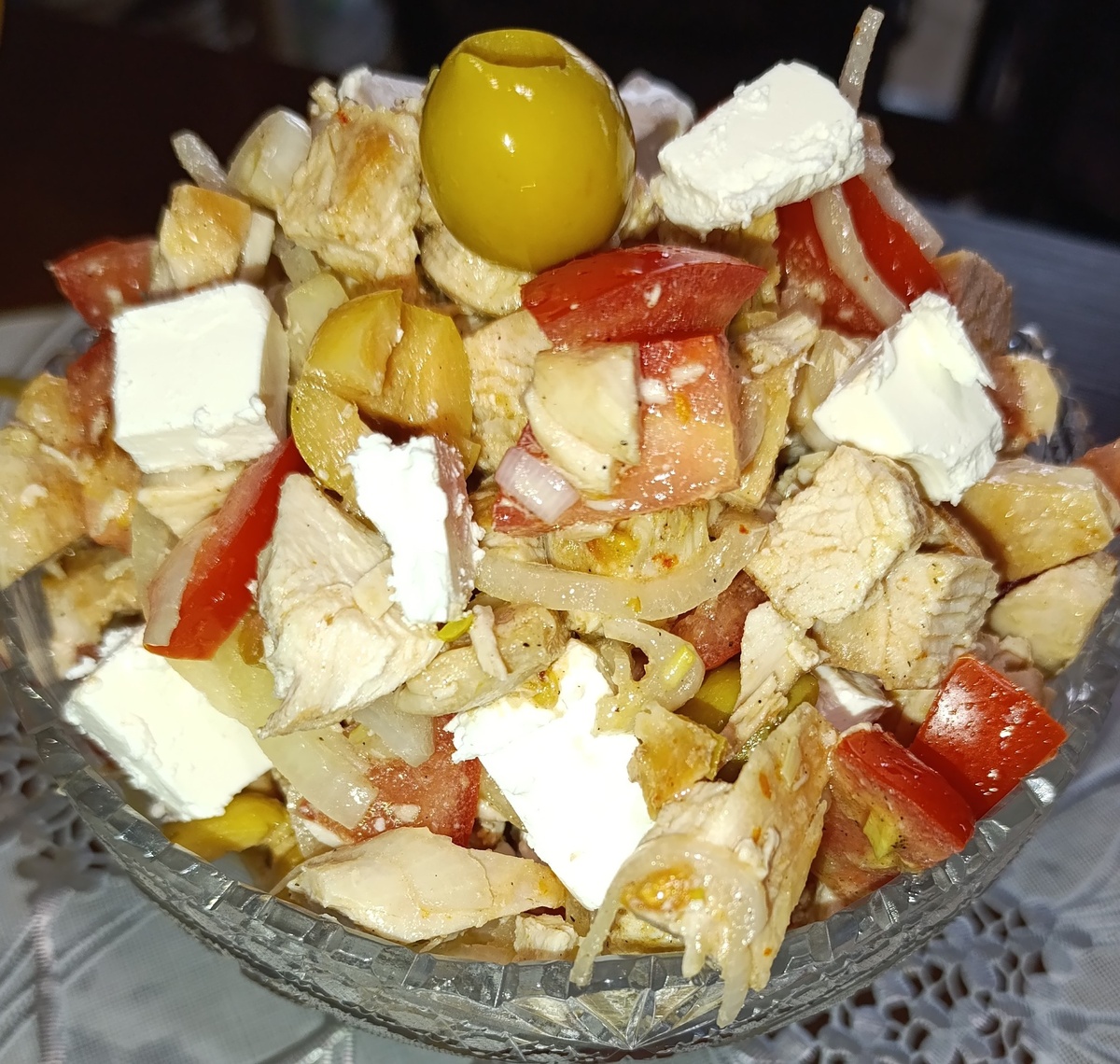 Ингредиенты: куриная грудка - 2 шт лук репчатый - 1 большая или 2 среднего размера помидор - 1 -2 шт оливки - 3-4 крупных или 5-6 помельче сыр фета (или фетакса) 100 гр чеснок - 1-2 зубчика оливковое масло - 25 гр перец молотый - 0,25 ч л (можно чуть меньше) перец чили - по вкусу Куриную грудку разрезаем вдоль, солим, перчим перцем чили и обжариваем. Лук нарезаем полукольцами. Перекладываем в посуду наливаем кипятка, добавляем 1 ст л уксуса и 1 ч л сахара, перемешиваем. Маринуем минут 15-20. Обжаренную курицу нарезаем кубиками. По истечении необходимого времени из лука сливаем воду через сито и добавляем лук к курице. Добавляем помидор, нарезанный кубиками. Перемешиваем и добавляем нарезанные оливки. Заправляем оливковым маслом смешенный с измельченным чесноком и перцем, добавляем немного соли (совсем чуть-чуть, просто, чтобы присолить помидоры, учитываем, что еще будет соленый сыр), перемешиваем. Сыр фету нарезаем кубиками. Выкладываем салат в салатник: немного салата, сверху кубики