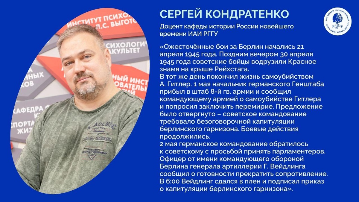 🔥 #ВЭтотДень 2 мая 1945 года Красная Армия полностью овладела столицей Германии в ходе Берлинской стратегической наступательной операции. 🗣️ Сергей Кондратенко, доцент кафеды истории России новейшего времени ИАИ РГГУ рассказал об этом событии: «Ожесточённые бои за Берлин начались 21 апреля 1945 года. Медленно, но верно красноармейцы продвигались к центру города и поздним вечером 30 апреля 1945 года советские бойцы водрузили Красное знамя на крыше Рейхстага. В тот же день покончил жизнь самоубийством А. Гитлер – Третий Рейх доживал свои последние часы. 1 мая начальник германского Генштаба генерал пехоты Г. Кребс прибыл в штаб 8-й гв. армии и сообщил командующему армией генерал-полковнику В.И. Чуйкову о самоубийстве Гитлера и попросил заключить перемирие. Данное предложение было отвергнуто – советское командование требовало безоговорочной капитуляции берлинского гарнизона. Боевые действия продолжились. В 1:00 2 мая германское командование обратилось к советскому с просьбой принять