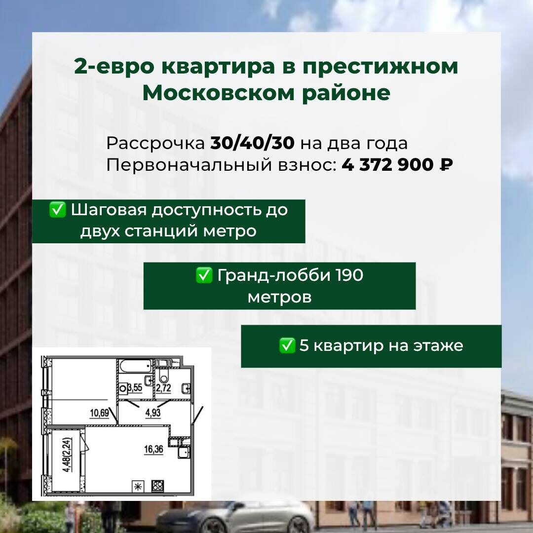 2-евро квартира в новом комплексе бизнес-класса в Московском районе До метро «Московские ворота» и «Электросила» — 12 минут пешком, до центра — 15 минут на машине. Рядом ЗСД. Чем мне нравится этот проект: — Дом бизнес-класса с выразительной архитектурой в индустриальном стиле — редевелопмент территории «Петербургской макаронной фабрики» — Просторное гранд-лобби 190 м², ресепшен, натуральный камень, световая инсталляция — Панорамные окна, террасы, квартиры с отдельным входом и приватной зоной отдыха — Уникальное озеленение во дворе: высокие деревья, цветники, злаки и скульптуры — Детское пространство от команды «Дом Сказки», добрососедский центр, коворкинг, библиотека и игровые зоны — Паркинг на 270 машин и даже 15 мест для электрокаров Условия покупки: Рассрочка 30/40/30 на 2 года Первоначальный взнос — 4 372 900 Подходит как для жизни, так и для инвестиций — Московский район стабильно популярен у арендаторов. Посмотреть другие планировки и рассчитать варианты рассрочек можно, нап
