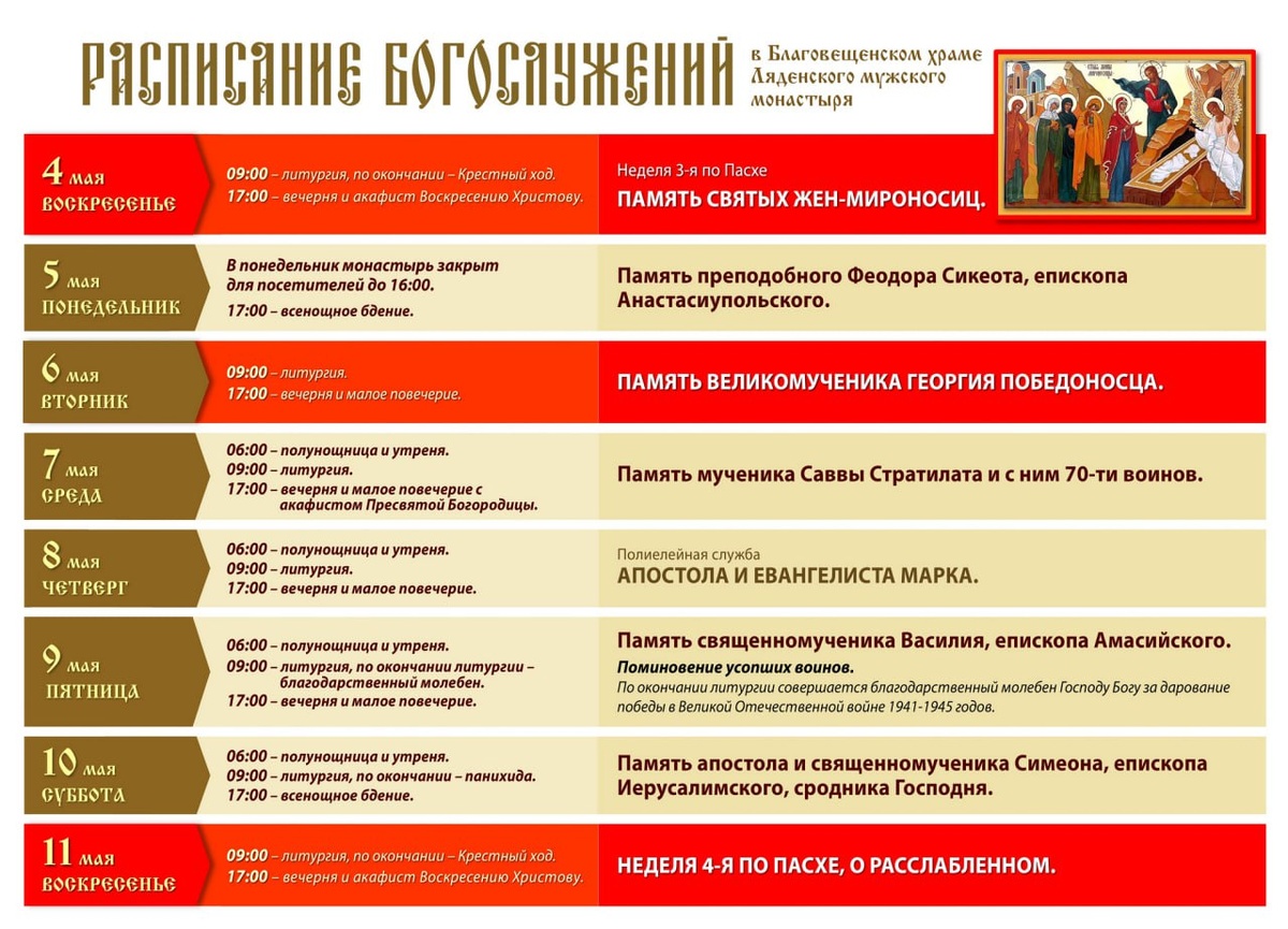 Расписание богослужений в Ляденском монастыре 4-10 мая 2025 г