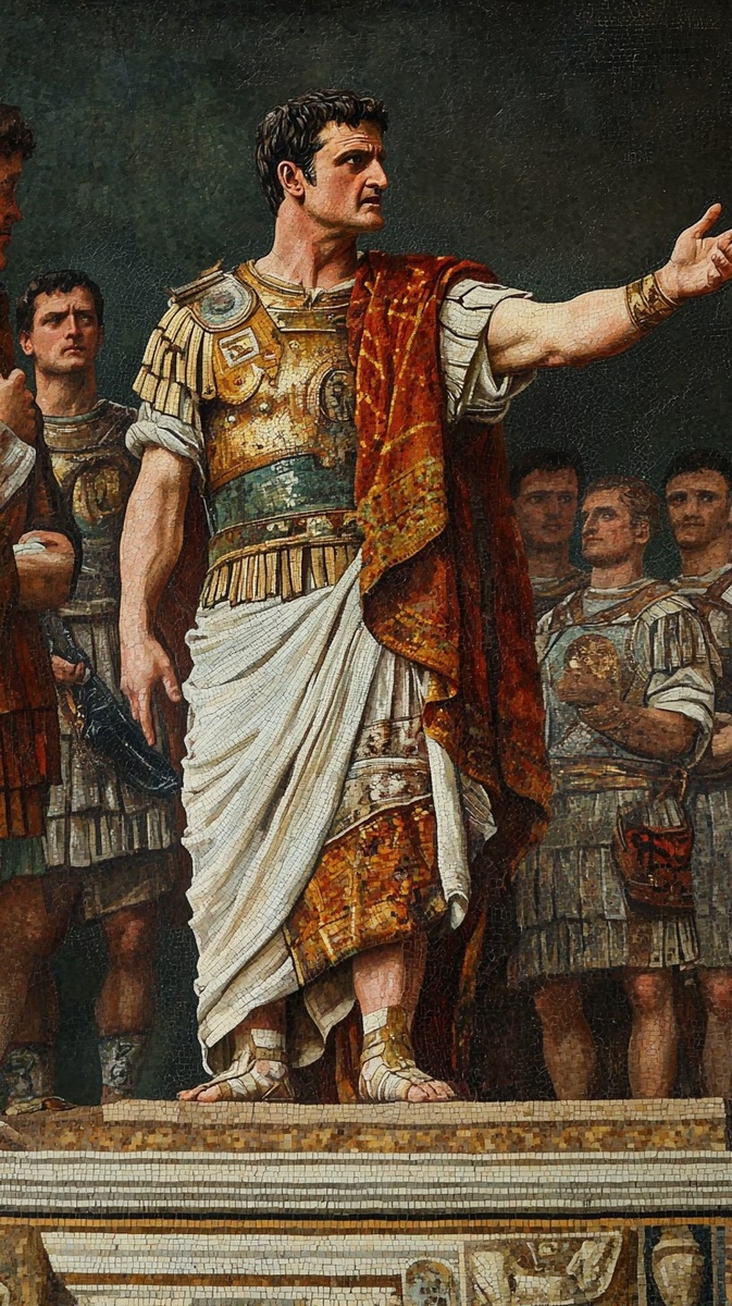 Создано на основе запроса: Caligula on a raised platform, scowling and gesturing sharply at soldiers. His advisors smirk behind him. The mood shifts instantly. Ancient Roman mosaic style