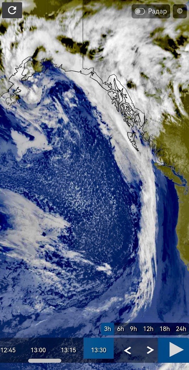 На фоне заворачивания циклона на Аляске, хвост которого вытянулся вдоль разломов на западном побережье Северной Америки (фото 1-2), начали формироваться ОСТИ по типу провала в тумане от Северной Калифорнии до острова Ванкувер. Если делать оценку по самому протяженному значению щели на фото 4, то потенциальная магнитуда тянет на событие М7.1 Протяженность щелей в тумане плавает в большую и меньшую сторону, ОСТИ формируются до сих пор по мере приближения хвоста циклона к побережью. В течение 9 дней есть вероятность сильного землетрясения по зоне (М6-7.1) ===== Against the background of the wrapping up of the cyclone in Alaska, the tail of which stretched along the faults on the west coast of North America (photos 1-2), CSTIs began to form like a dip in the fog from Northern California to Vancouver Island. If we make an estimate based on the longest value of the gap in photo 4, then the potential magnitude pulls on the M7.1 event. The length of the cracks in the fog is floating up and d