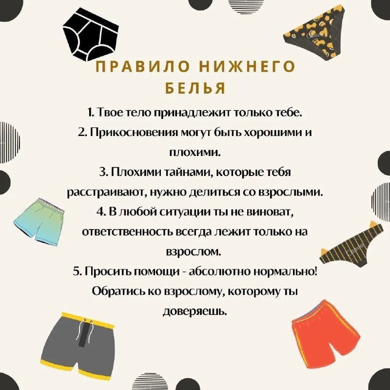 ☝️ Правило нижнего белья Мы что-то давно не говорили про половое воспитание Научите детей этому правилу. Начинать можно примерно с 2,5-3 лет 💡 Суть в следующем: всё, что прикрывают трусики, принадлежит только ребёнку 🟡 Никто не может трогать эти зоны без разрешения, исключение: врачи, и то только в присутствии родителей; узкий круг близких (мама, папа, бабушка) 🔵В случае чего, обо всём нужно говорить взрослым И помним, главное не запугиваем. Мы не хотим, чтобы ребёнок рос с ощущением, что мир вокруг – опасное место. Мы хотим, чтобы он знал: он в безопасности, потому что умеет защищать свои границы Больше информации в нашей группе, переходите