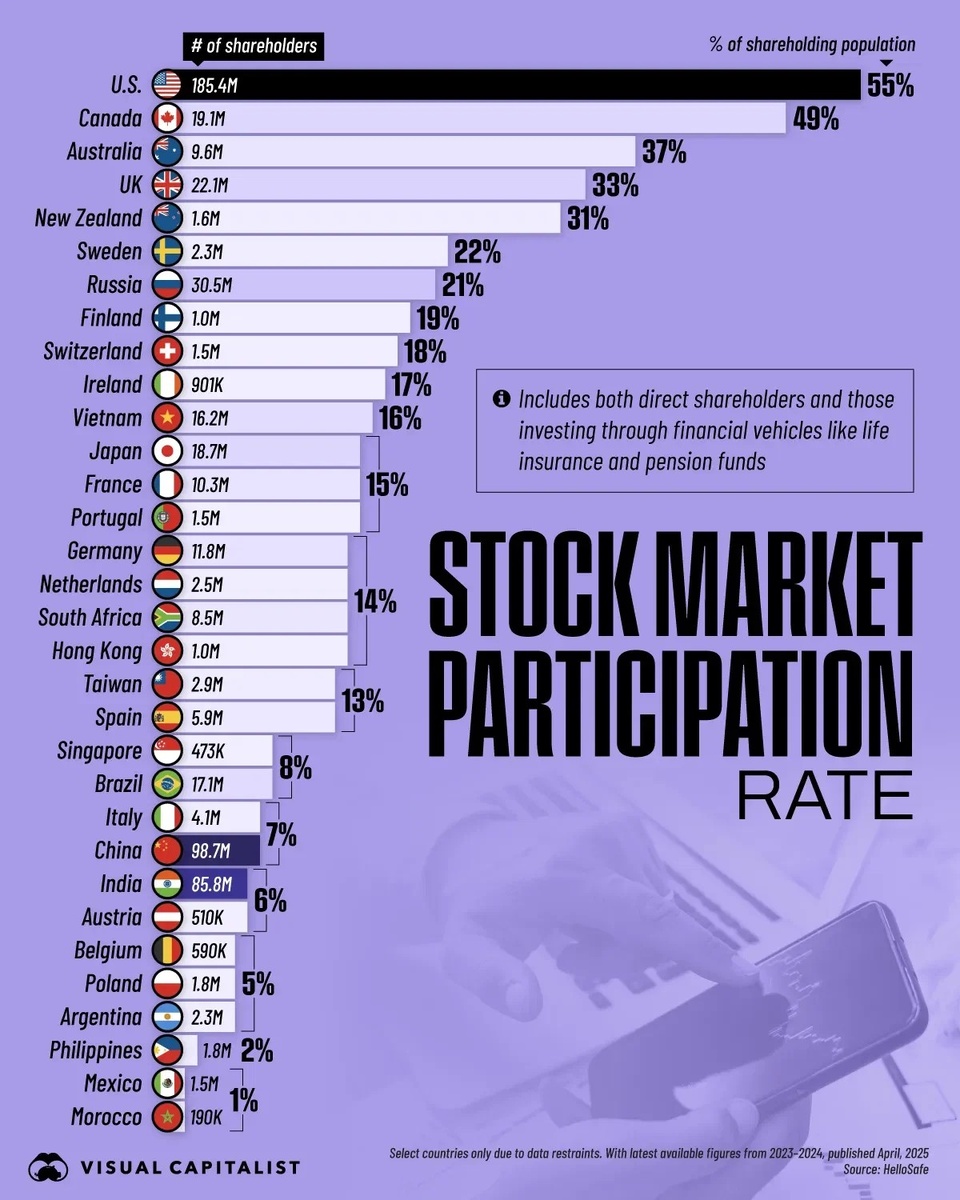 Интересная статистика от сервиса HelloSafe На инфографике показано общее количество инвесторов, владеющих акциями в разрезе по странам и доля в % от общего населения. Первые строчки не вызывают удивления. Самый активный рынок в Северной Америке🇺🇸🇨🇦. Не знал, что Россия🇷🇺 уже на 7 месте по доле частных инвесторов к общему населению. Допускаю, что цифры могут быть не точные. Что точно, так это то, что поведение частных инвесторов все сильнее влияет на рынки. Эта тенденция началась в 2020 году и сохраняется до сих пор, благодаря развитию брокерских приложений 📱 и упрощению доступа частных клиентов к биржевым торгам. Так, например, статистика апреля в США показала, что частные инвесторы покупали акции на просадках, в то время как многие фонды резали позиции. По итогу в моменте видим американский рынок торгуется выше, чем был 2 апреля до объявления тарифов Трампом.