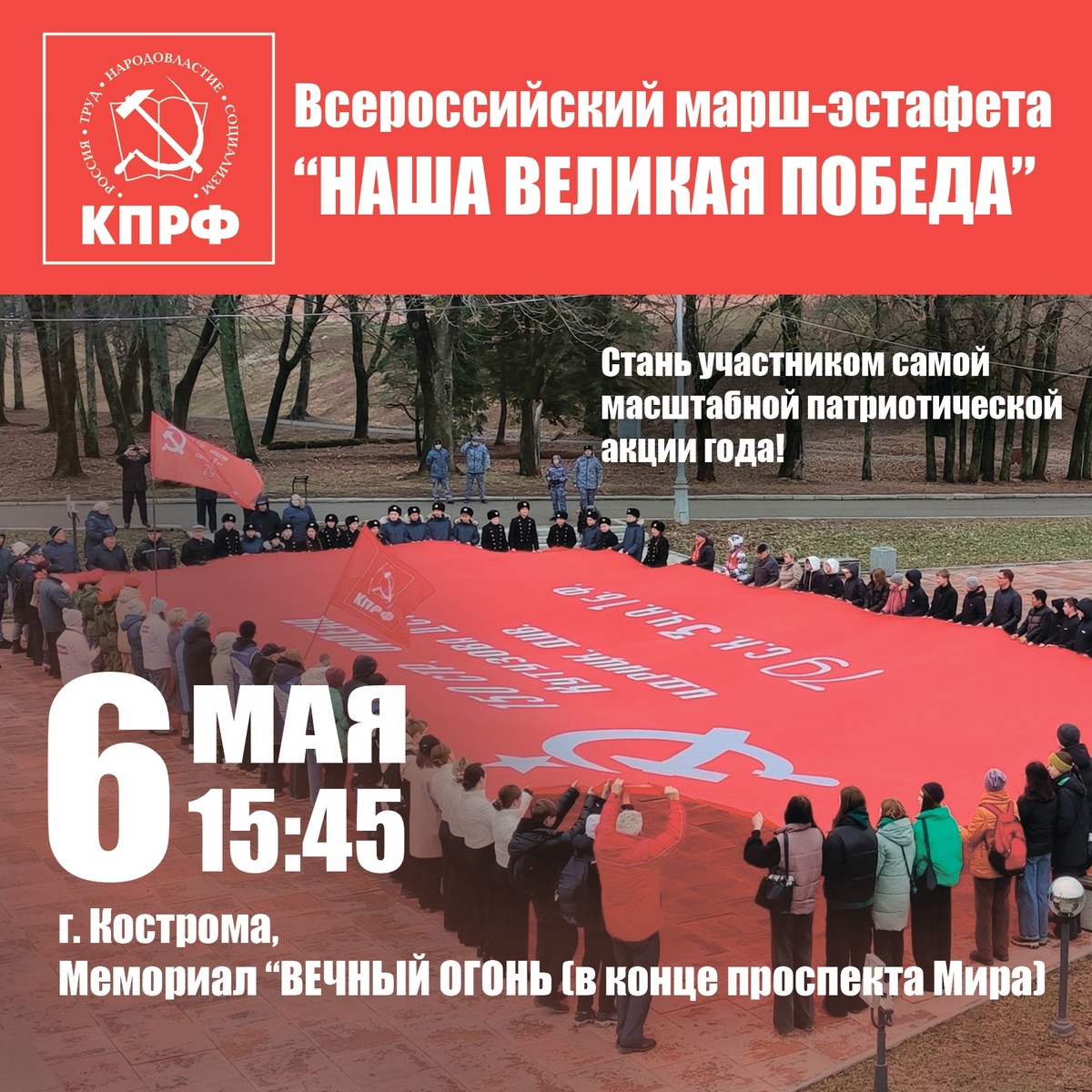Жителей города приглашают встретить почетного «гостя» 6 мая в 15:45 в Кострому прибудет увеличенная копия легендарного Знамени Победы. Костромское отделение КПРФ приглашает жителей города встретить почетного «гостя» возле мемориала «Вечный Огонь». Копия Знамени Победы начала свой путь 17 марта 2024-го года из города-героя Севастополя. За год Знамя успело побывать во многих городах РФ, отмеченных славой воинского подвига. Среди них республики Татарстан и Удмуртия, Пермская и Ульяновская области. В Костроме у мемориала «Вечный огонь» состоится патриотическая акция в честь 80-летия Великой Победы. «Это событие — наш общий долг перед теми, кто отстоял мир и свободу. Приходите всей семьей, чтобы почтить память героев, вспомнить историю Великой Победы и передать её свет будущим поколениям», — отмечает пресс-служба костромского отделения КПРФ.