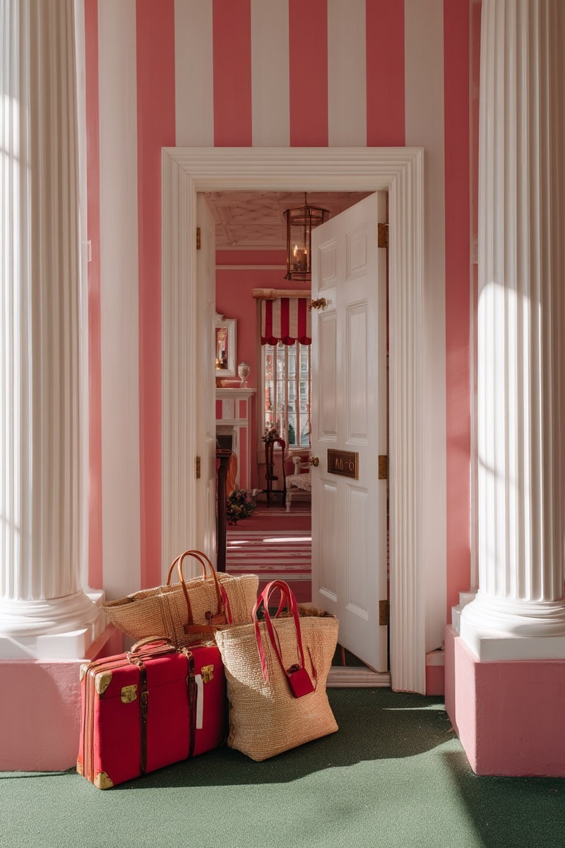 Создано на основе запроса: A bright pink and white striped cabana with two straw bags on the floor, green carpet, red luggage in front of