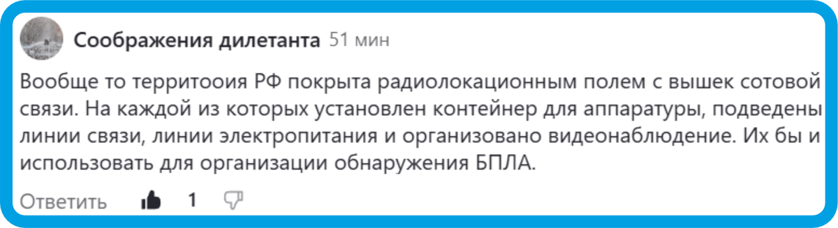 Но коэффициент усиления антенны на приём, мы не можем игнорировать. Известно, что для антенн базовых станций типовой коэффициент усиления порядка 10 dB. А для антенны Тор-М1, можно предположить 30 dБ. Понижающий коэффициент 100. В итоге, в приёмник базовой станции попадёт примерно в 300 000 раз более слабый (по мощности) сигнал, чем в приёмник Тор-М1 при равных ЭОП беспилотника и дальности до него. Одного этого факта достаточно, чтобы прекратить вздыхать о "нереализованных возможностях".