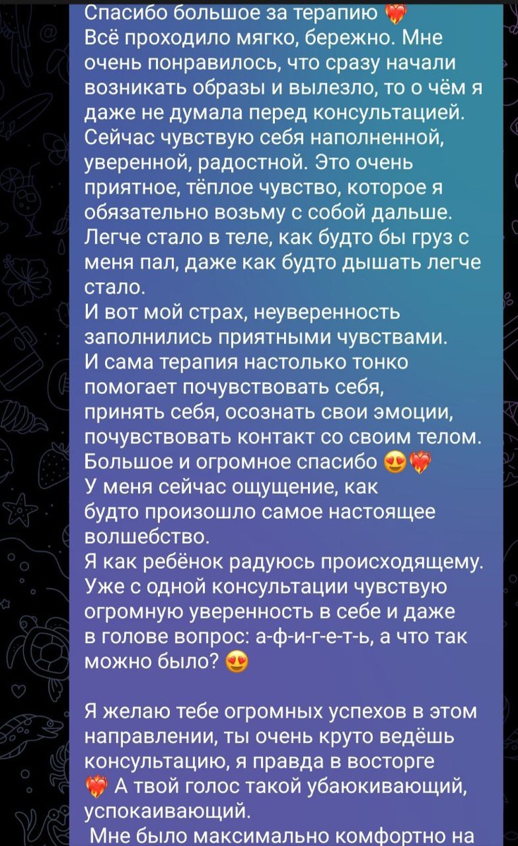Друзья, хочу поделиться)) В последнее время провожу консультации по методу эмоционально-образной терапии (ЭОТ) + сама сейчас прохожу личную терапию. Метод для меня новый, очень интересно, относится к моему любимому психодинамическому направлению психотерапии. Удивительные ощущения от работы и удивительные результаты. Чувствую, что этот метод меня вдохновляет и воодушевляет! 💕 Я всегда это знала, но сейчас убедилась наверняка - волшебная палочка существует! Это наша с вами психика, душа, назовите, как хотите. Даже в самых тяжёлых, болезненных, травмирующих её ситуациях она способна себя защитить и всегда знает, как себя исцелить и восстановить свою целостность. Во истину, все ответы и решения внутри нас. Терапевт не лечит и не спасает, он - просто проводник, попутчик, который помогает клиенту пройти сквозь лес своих переживаний, немного подсвечивая тропинку фонариком. Идя рядом, порой, держа клиента за руку, терапевт сопровождает его в его пути к себе и к своему исцелению. Я благ