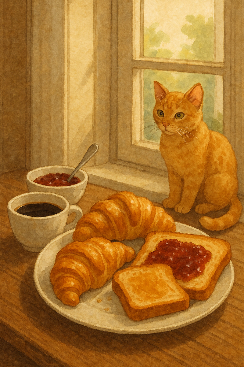 Не обязательно накрывать стол по всем канонам. Можно сидеть в старом свитере, с тарелкой на подоконнике, и с котом, который пытается украсть кусочек тоста. Французский завтрак — это про маленькое удовольствие. Оно не требует ни вида на Эйфелеву башню, ни новых тарелок. Только немного времени для себя.