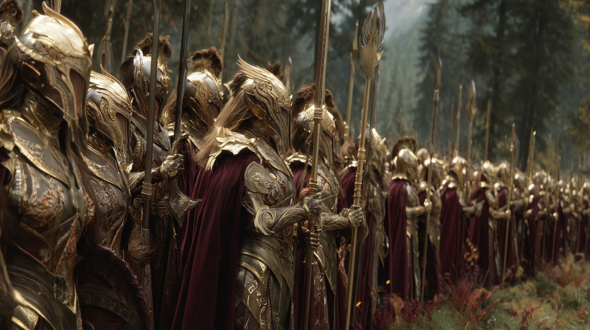 Создано на основе запроса: Cinematic, hyper-realistic daylight. It's raining. Medium shot. High definition. A huge army of elves in golden armor with maroon cloaks with spears and oblong shields stand in a tight formation. The action takes place against the backdrop of meadows and oak forests. Add lots of explosions. : :