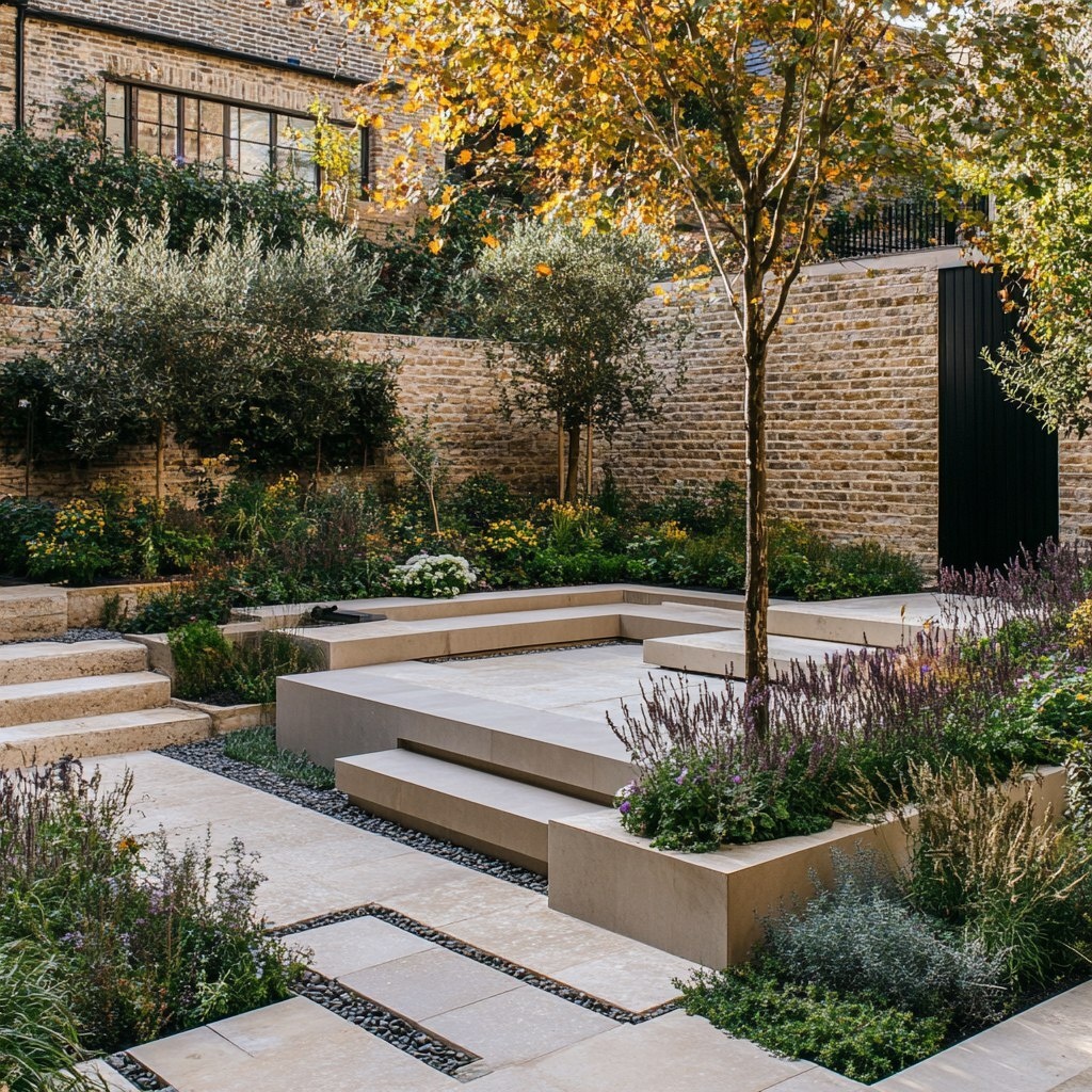 Создано на основе запроса: Sunken courtyard garden with layered landscaping and architectural planting design