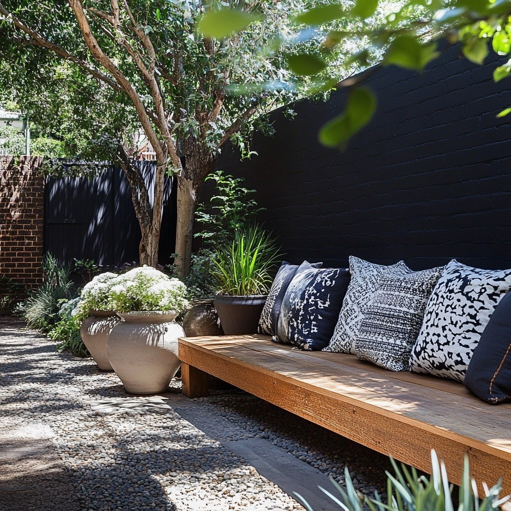 Создано на основе запроса: Mid-century inspired outdoor garden with raw timber bench and ceramic urns