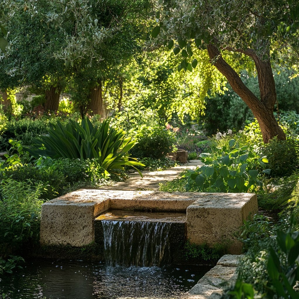 Создано на основе запроса: Stone water feature in a serene California garden, surrounded by greenery